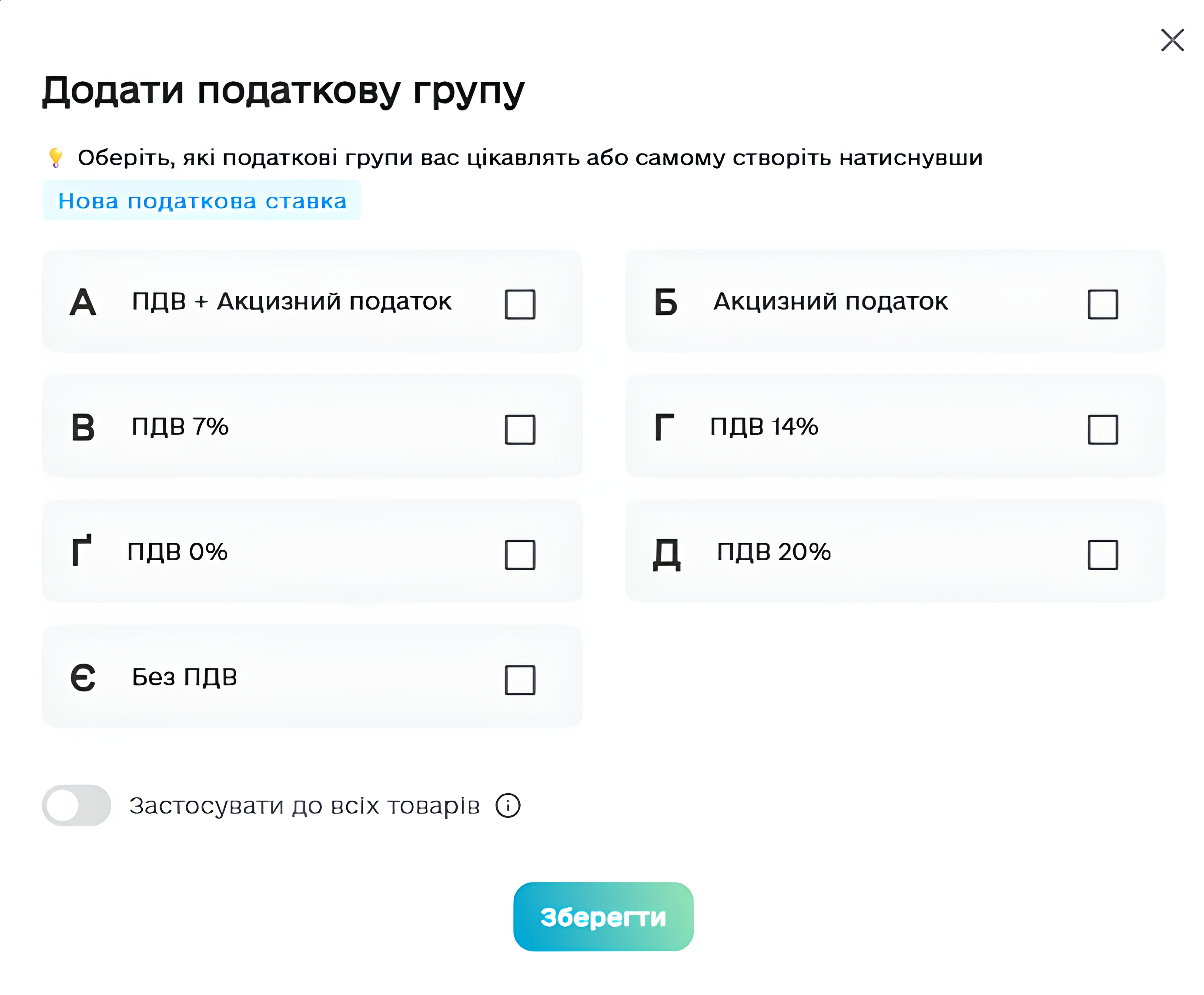 За замовчуванням доступна ставка "Без ПДВ". Платникам ПДВ або акцизу потрібно додати відповідні ставки.